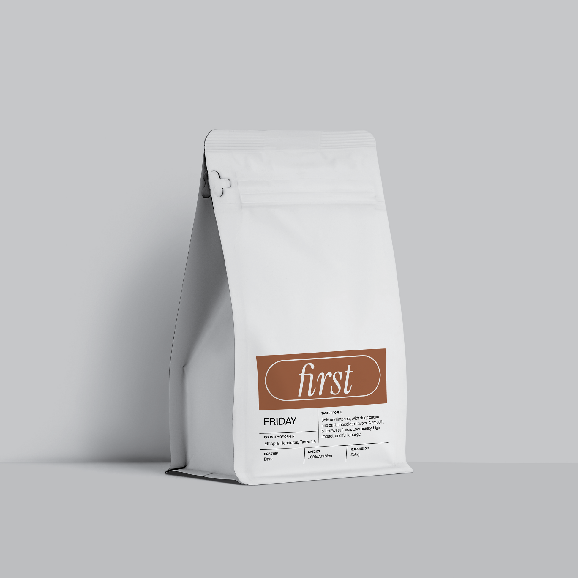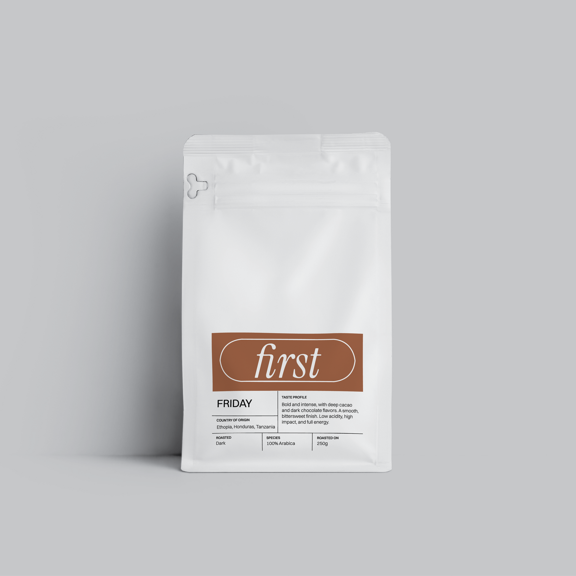 At First Coffee, we like to keep things simple and approachable. That's why we've named our beans after days of the week. No complicated jargon, no coffee snobbery—just great tasting coffee that's straightforward, delicious, and makes every morning better.