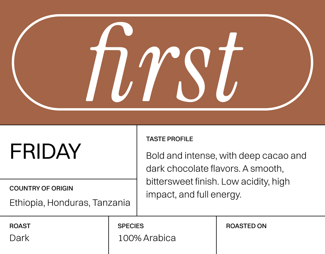 Jumpstart your weekend with Friday, our bold and intense dark blend. This special combination of Ethiopian, Honduran, and Tanzanian 100% Arabica beans delivers deep, rich cacao and dark chocolate flavors with a smooth, bittersweet finish. Low acidity, high impact—Friday beans pack pure energy, making every sip the perfect weekend kickoff.